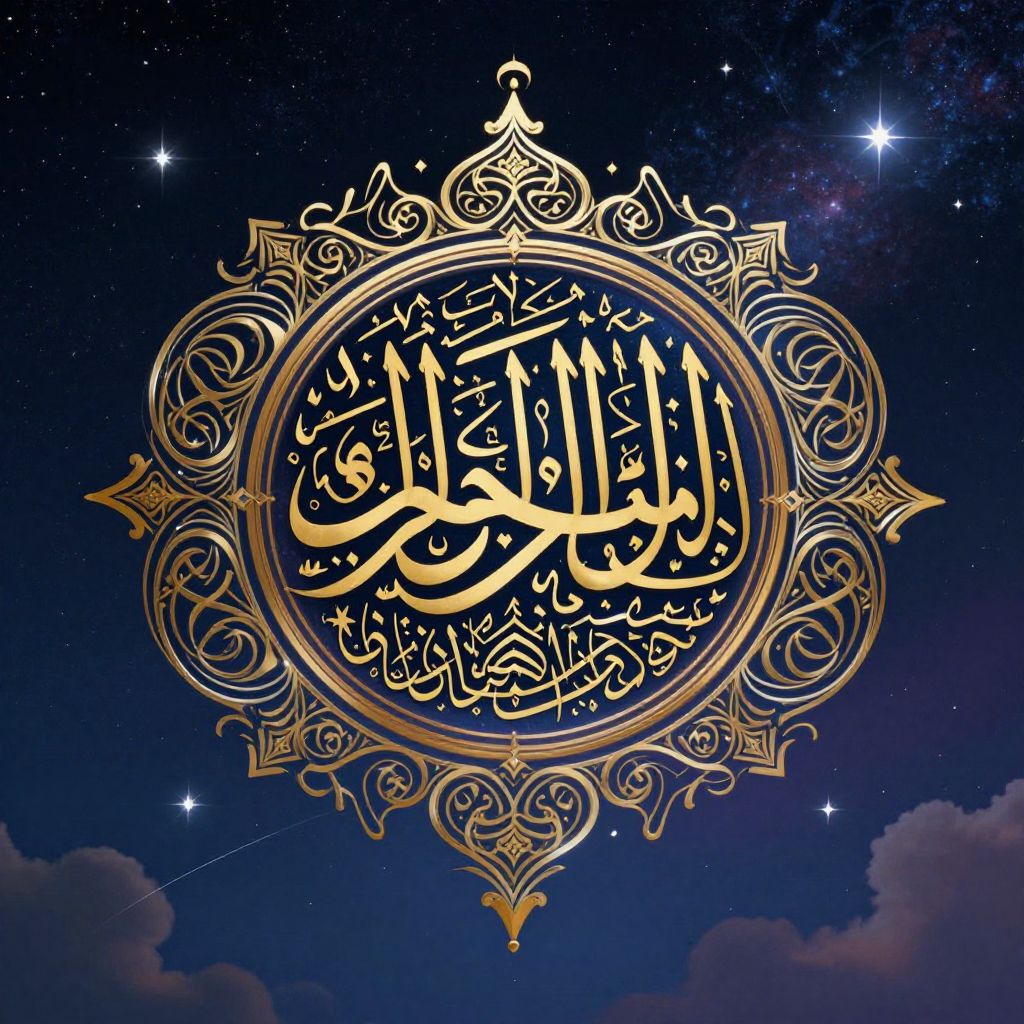 Islamic AI images prompt: An elegant fusion of traditional Islamic calligraphy and AI-generated visual elements, floating in a celestial night sky with stars and flowing arabesques, digital art style, vibrant colors, intricate patterns, fantasy realism, cinematic lighting.