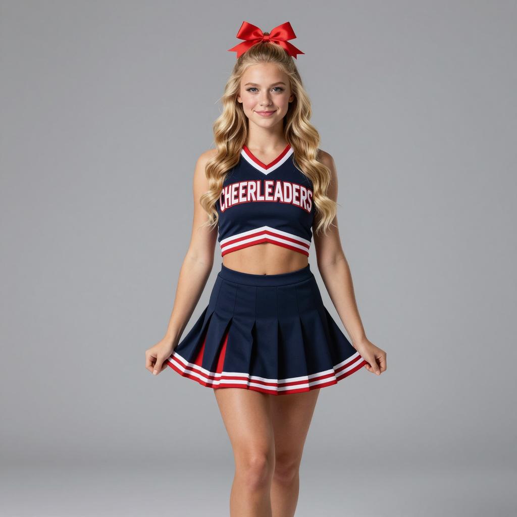 Dallas cheerleader costume, photograph of a young female cheerleader, standing in a hallway, blue cheerleader outfit with "DALLAS" on the chest, long brown hair with blue bow, red pom-poms, white sneakers, smiling, sunlight from windows in background, hallway with tan walls and tiled floor, full body, frontal view, realistic style, warm lighting, slight depth of field, casual pose