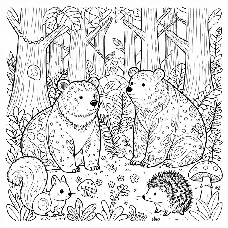 Intricate forest animals coloring page showcasing bears, squirrels, hedgehogs, and birds surrounded by lush forest foliage, mushrooms, and flowers, designed with bold outlines and patterns for a playful coloring experience.