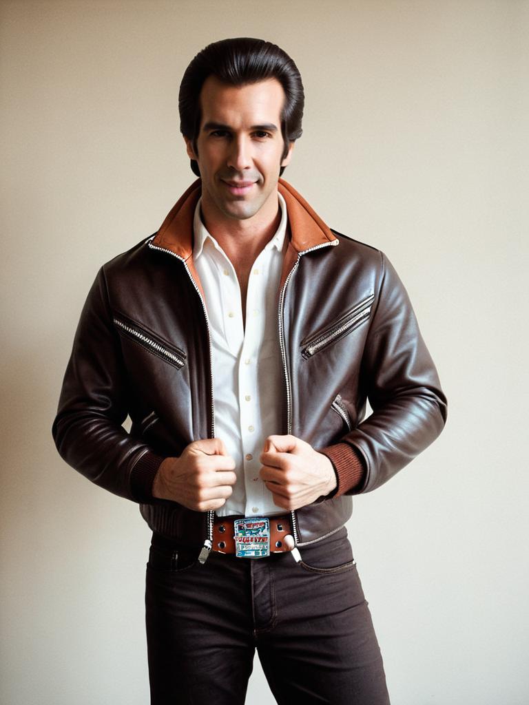 Portrait of a man dressed in a realistic cosplay costume of The Fonz, a popular character from the TV show 'Happy Days.' He is wearing a brown leather jacket with a white collared shirt underneath, dark pants, and a distinctive belt featuring a bold buckle. The man has slicked-back dark hair, styled to match the iconic character's look.