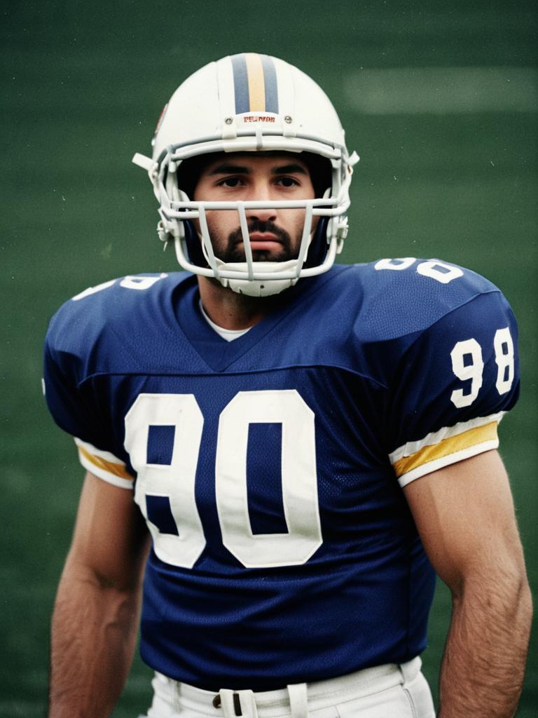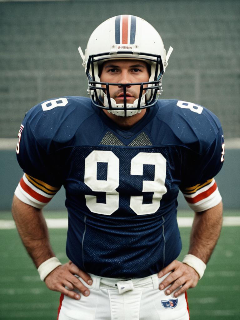 Portrait of a male American football player wearing a white helmet with blue and orange stripes, a navy blue jersey with the number 93, and white pants. The athlete stands with hands on hips on a football field, ready for action.