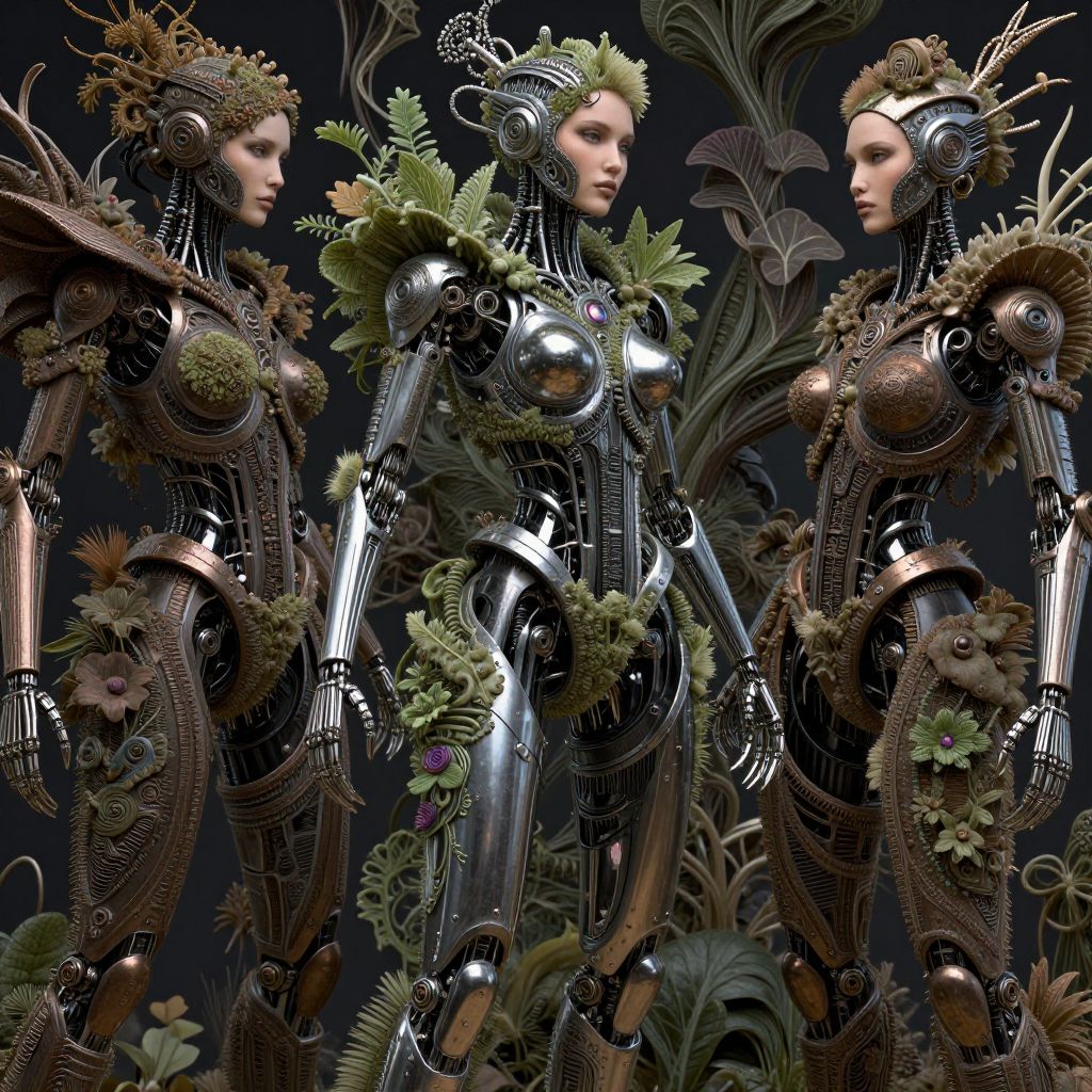 This is a highly detailed digital CGI image depicting three humanoid robots adorned with intricate, nature-inspired mechanical armor and floral decorations. Their metallic bodies are shiny and reflective, featuring complex, interconnected gears and wires. The robots' heads are human-like with pale skin, and their faces are serene and expressionless. They have leafy, plant-like hair and wear elaborate armor embellished with greenery, including leaves and flowers. The background is dark, making the robots' metallic and floral details stand out prominently. The overall style is a blend of steampunk and bio-mechanical aesthetics, creating a futuristic yet organic feel.
