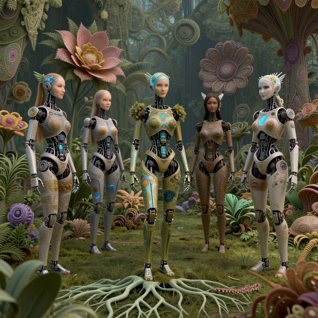 The image depicts a highly detailed and intricate scene of biomechanical women robots, blending elements of botanical and cybernetic design. The figures are adorned with elaborate, organic-like structures that resemble both plants and mechanical components, creating a surreal fusion of nature and technology. The color palette is predominantly metallic and industrial, with shades of silver, bronze, and black, accented by vibrant, bioluminescent hues that add a sense of life and energy to the otherwise mechanical forms. The textures range from smooth, polished metal to rough, organic fibers, emphasizing the contrast between the two worlds. The spatial relationships are complex, with the figures intertwined and overlapping, creating a sense of depth and movement. The overall composition is dynamic, with the figures positioned in various angles and orientations, suggesting a sense of motion and interaction. The scene is rich in detail, with intricate patterns and textures that add to the visual complexity and depth of the image.