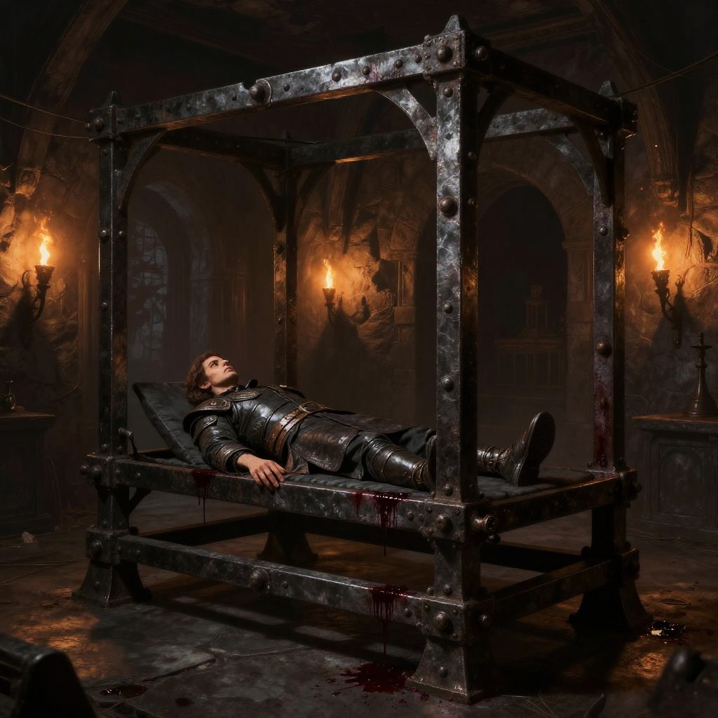 Ancient torture bed in a sinister underground torture chamber, heavy iron framework, bloodstains, flickering torches, dark fantasy illustration, high detail