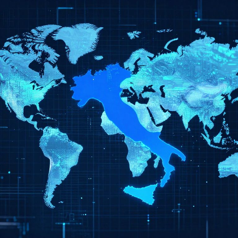 World map with Italy highlighted boldly in electric blue, futuristic digital grid overlay, pixelated continents with glowing edges, science fiction inspired, cyberpunk color palette, intricate data lines