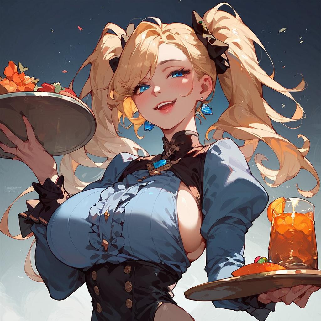 Score_9, score_8_up, score_7_up, disembodied_head, on tray twintails blue eyes fangs smile, on tray, large breasts