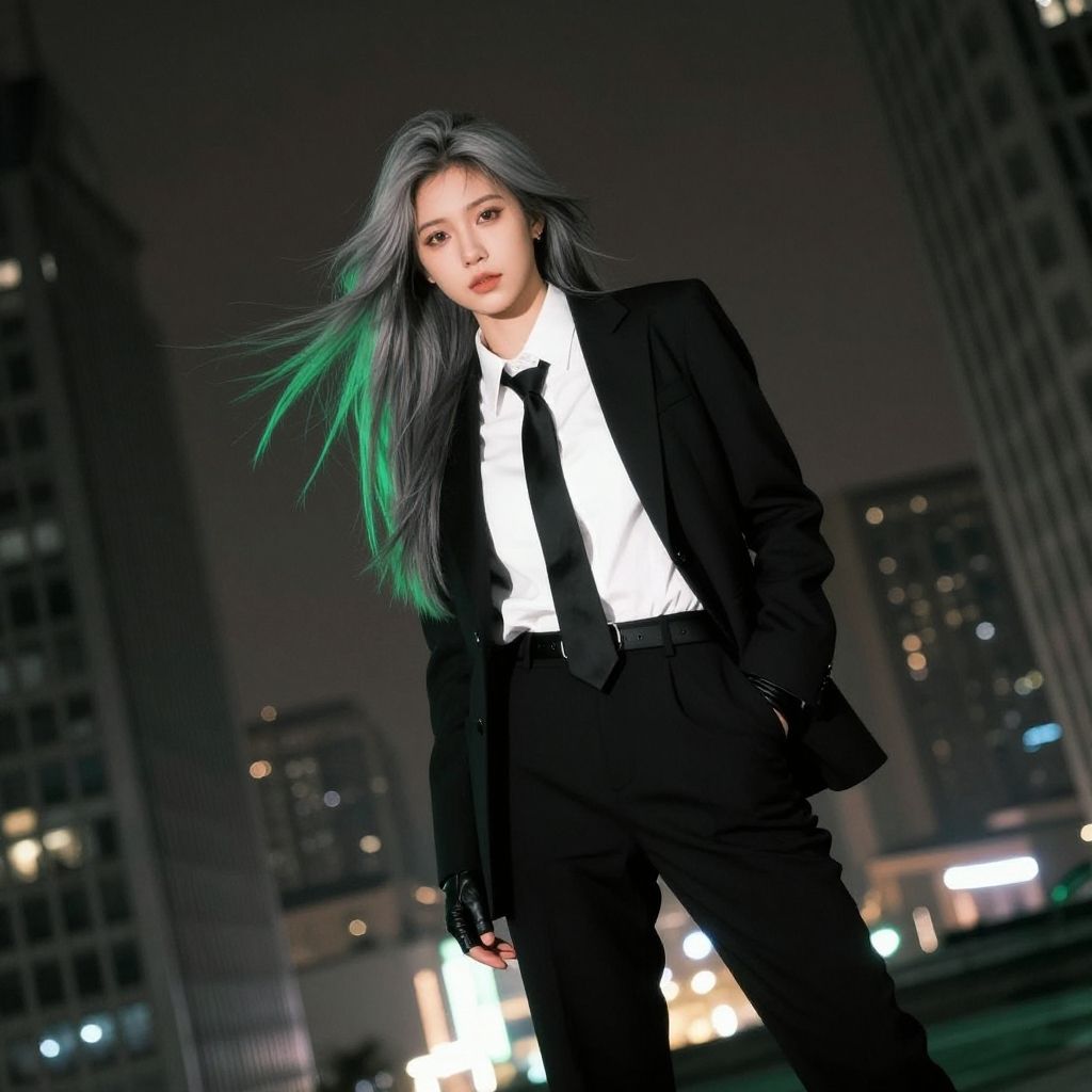 Digital artwork of an Asian woman in a black suit, white shirt, and black tie, with long black hair, standing in a neon-lit urban