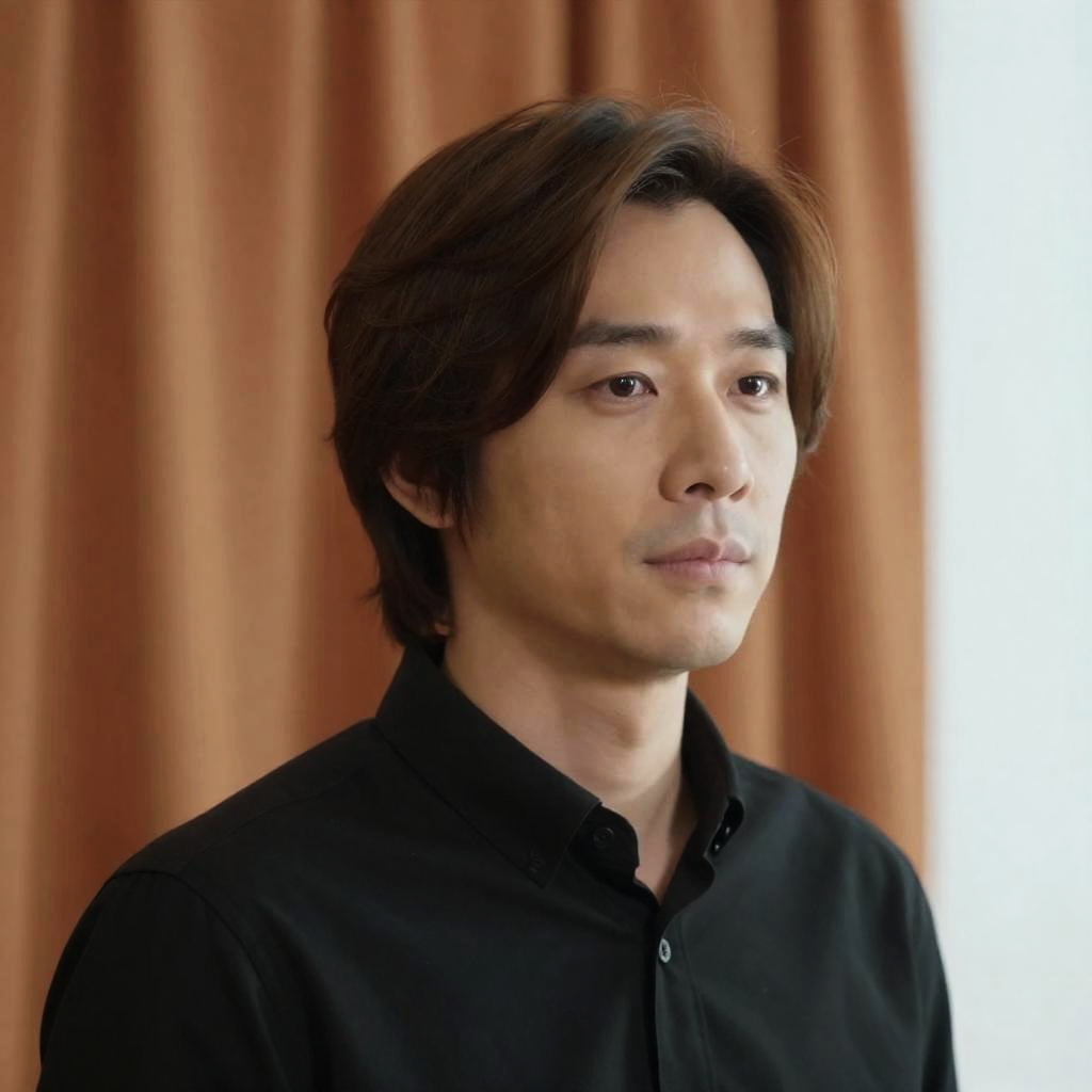 Photograph of an Asian man with slicked-back black hair, light skin, and intense gaze, wearing a white shirt, in a dimly lit, red-walled room with a blurred orange lamp in the background. Blurred figure in the background.