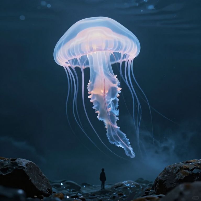 Photograph of a glowing, bioluminescent jellyfish with ethereal blue and white hues, floating above a small silhouette of a person standing on