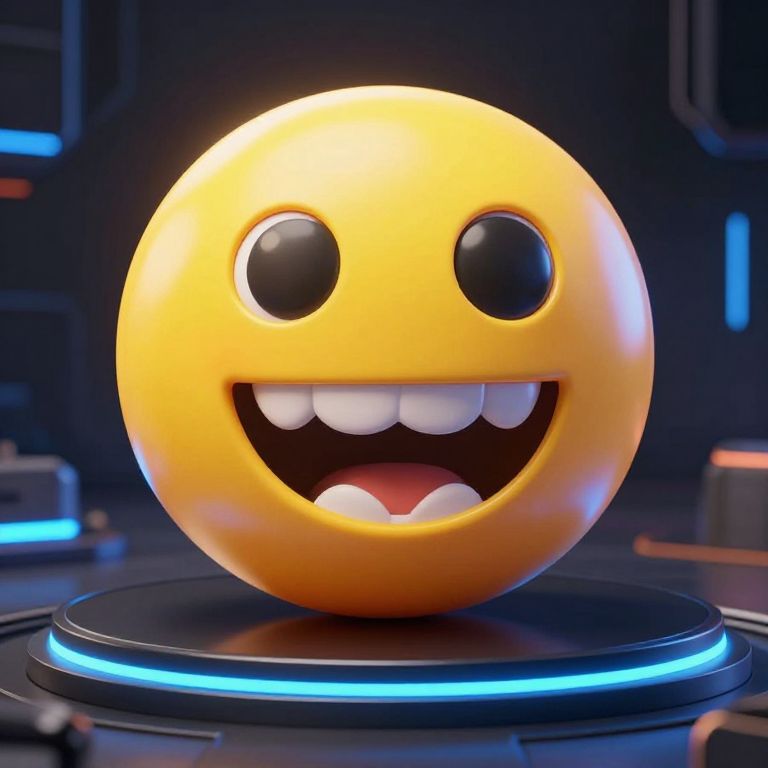 A vibrant, digital 3D rendering of a yellow, smiling emoji with large black eyes, a wide grin, and small, sharp teeth. The emoji sits on a black, circular platform with glowing blue lights in the dark, futuristic background. The glossy surface of the emoji reflects light, adding a shiny texture. The overall style is playful and slightly eerie.