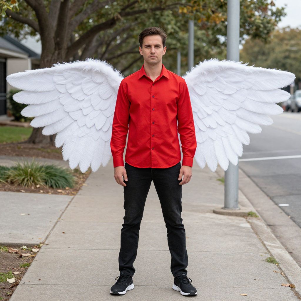 Photograph of a Caucasian man with short brown hair, standing on a suburban sidewalk. He wears a bright red button-up shirt, black pants, and black sneakers with white soles. He has large, white, fluffy angel wings attached to his back. The wings are symmetrical, with each wing having seven feather-like sections. The background shows a tree-lined street with a house partially visible on the left. The sidewalk is concrete, and the street has a white dividing line. The man looks directly at the camera with a neutral expression. The image is brightly lit with natural daylight.