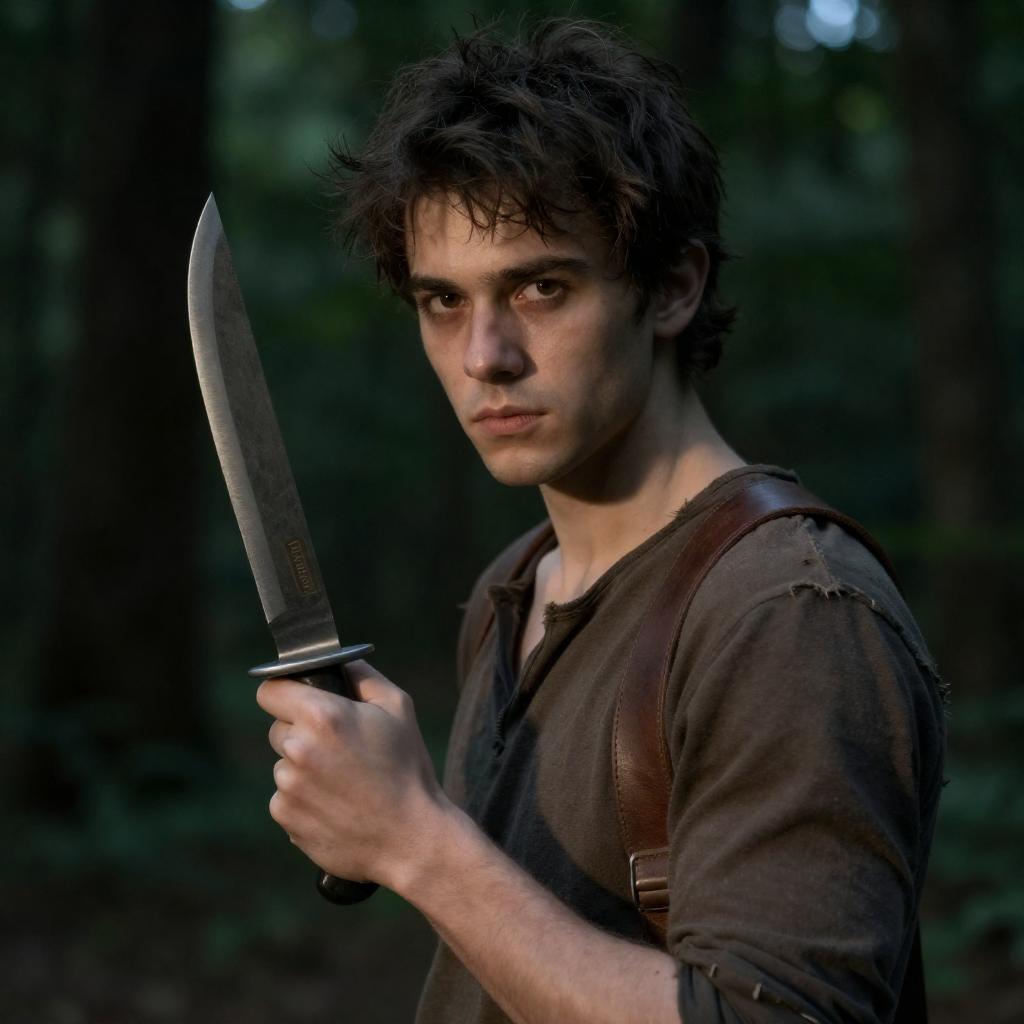 Photograph of a muscular, dirty, young man with dark, messy hair and blood on his face and tank top. He has a serious expression and a large knife strapped to his back. The background is a blurred, dark forest. The image has a gritty, survivalist feel.