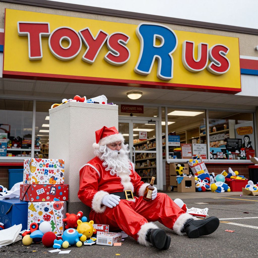 At the entrance of a Toys R Us store in Quincy, MA, featuring the iconic 'TOYS R US' logo and bright, recognizable signage, a disheveled Santa Claus is seated on the ground, dressed in an unconventional red latex costume, He's holding a bottle of whiskey, looking worn and somewhat homeless, Around him, hundreds of unwrapped presents are scattered, littering the environment with discarded toys and wrapping, creating a messy, neglected scene in front of the store, retr0grade80s