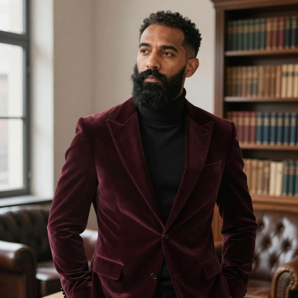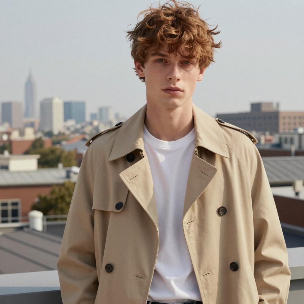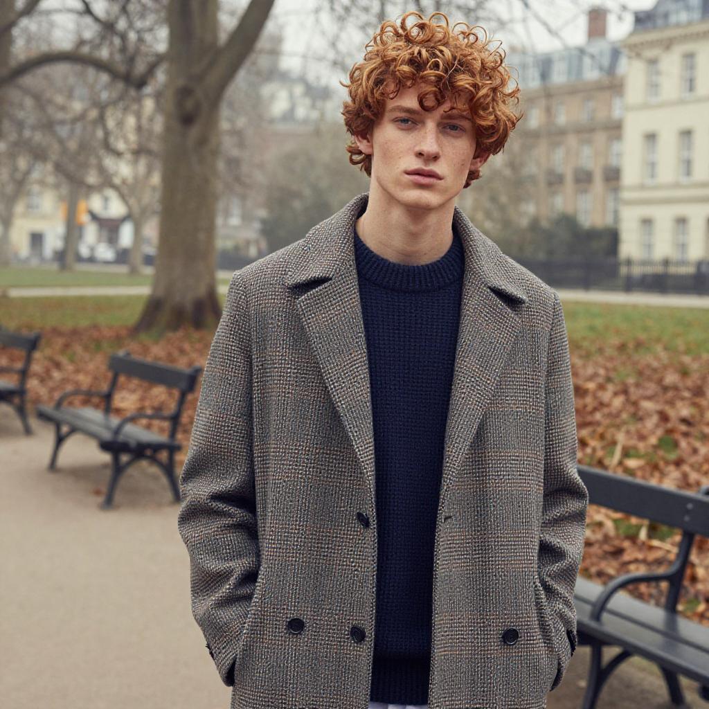 Editorial fashion photograph of middle-aged man with curly gray hair and light warm skin, wearing navy pea coat over cream knitted sweater, in coastal pier at golden hour with misty background, soft natural light, photoreal, natural skin texture, shallow depth of field, muted palette, clean background, refined composition, magazine editorial style, high dynamic range, subtle filmic grain, confident yet calm pose, precise color grading, professional studio quality