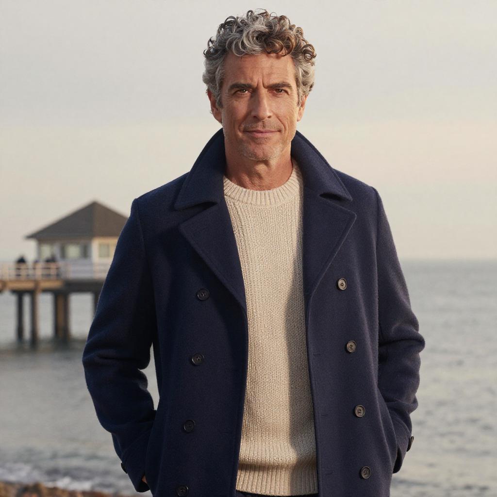 Photograph of a middle-aged man with curly gray and brown hair, standing outdoors by the sea. He has a fair skin tone and is wearing a dark navy blue double-breasted coat over a cream-colored knitted sweater. His hands are in his coat pockets, and he has a subtle smile. The background features a wooden pier with a small house on it, set against a calm ocean and a clear sky. The lighting is natural, suggesting it's either early morning or late afternoon. The man's facial features are strong and slightly weathered, giving him a distinguished look.