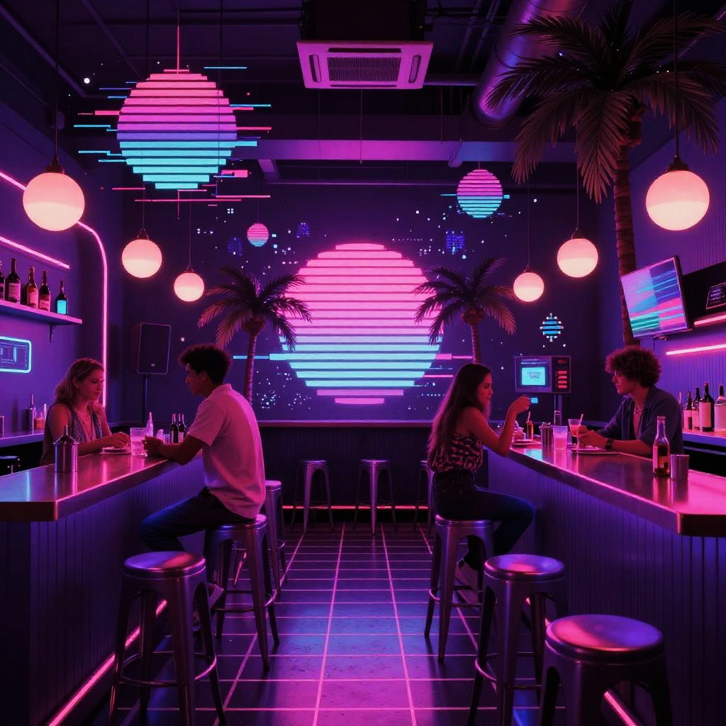 Vaporwave bar interior, neon pink and purple lighting, retro 80s aesthetics with palm trees and pixel art, synthwave vibes, grid patterns on floor, futuristic yet nostalgic atmosphere, glitch effects and VHS style distortion, patrons in vintage fashion relaxing