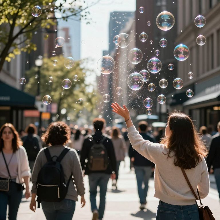 Photograph of a city street with sunlight, people walking, and a woman with curly hair blowing bubbles, creating a sparkling, translucent effect.