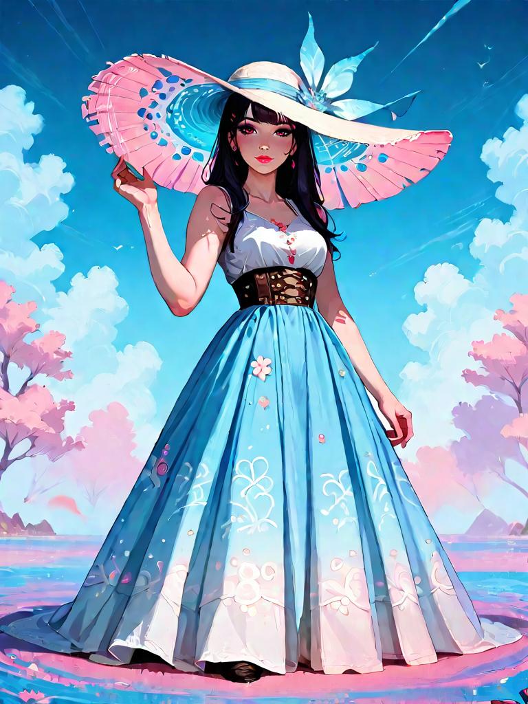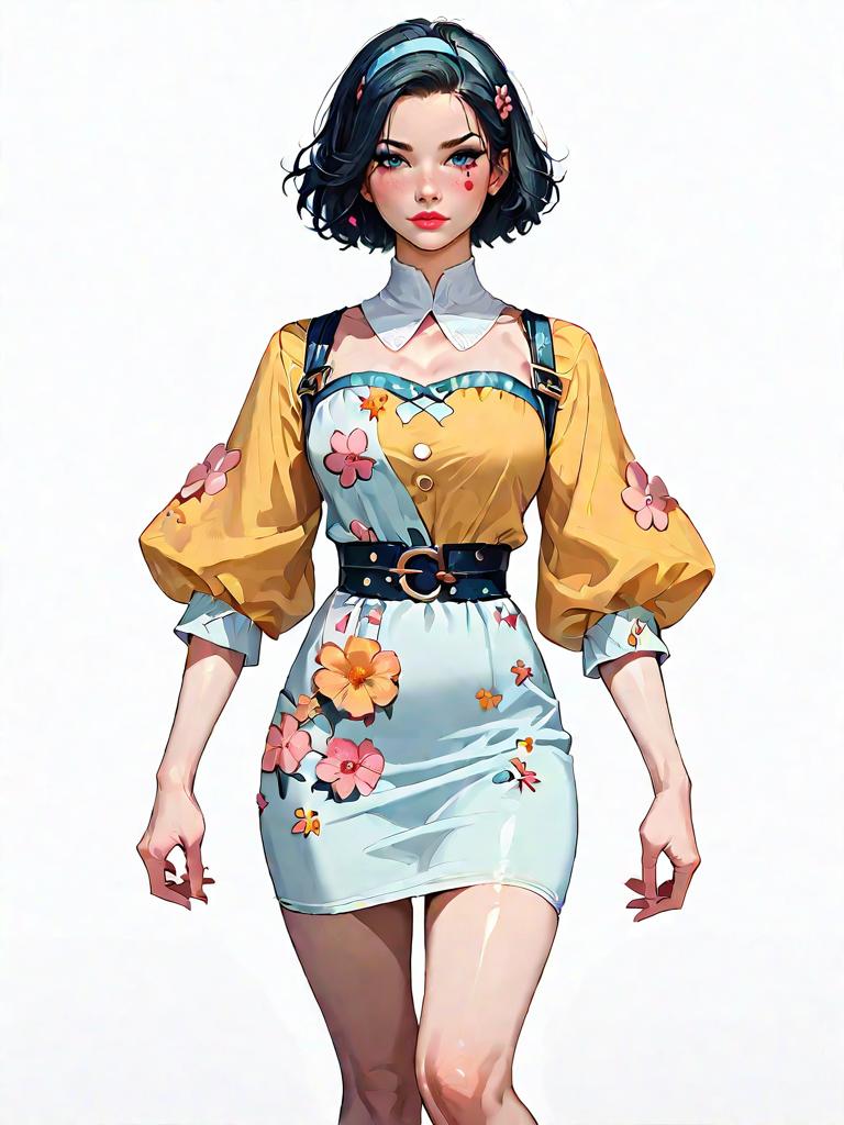 Digital illustration of a woman with a realistic face, wearing a modern romantic dress. The dress features a red lace bodice with short sleeves, a high neckline, and a slim-fit silhouette. The skirt is light blue with vibrant red and pink floral embroidery and a flowing style. The image shows a full-body shot against a plain white background.