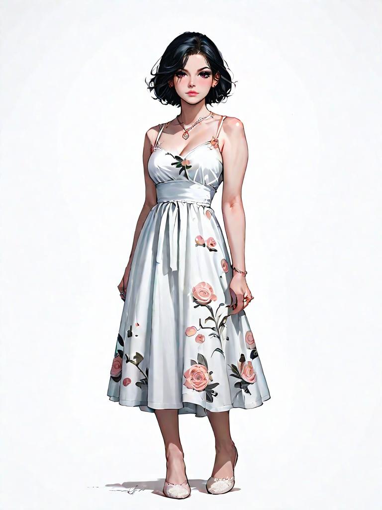 1girl, source_comics, realistic face, full body shot, Woman, modern romantic, red lace dress with floral embroidery, high neckline, short sleeves, slim-fit silhouette, knee-length with scalloped hem, plain white background.