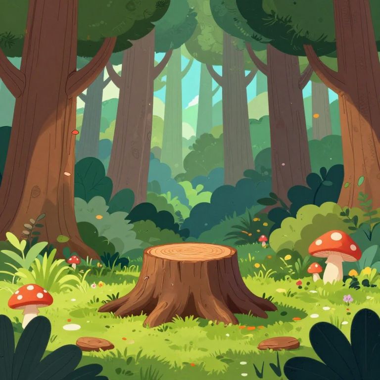A vibrant animated cartoon forest scene with colorful trees, mushrooms, and a tree stump in the center.