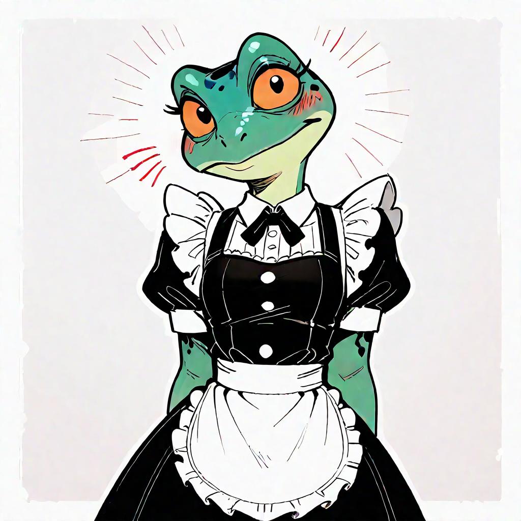Score_9, score_8_up, score_7_up, score_6_up, score_5_up, score_4_up, pepe the frog wearing a maid outfit, frog, amphibian, looking at viewer, male, blushing, embarrased