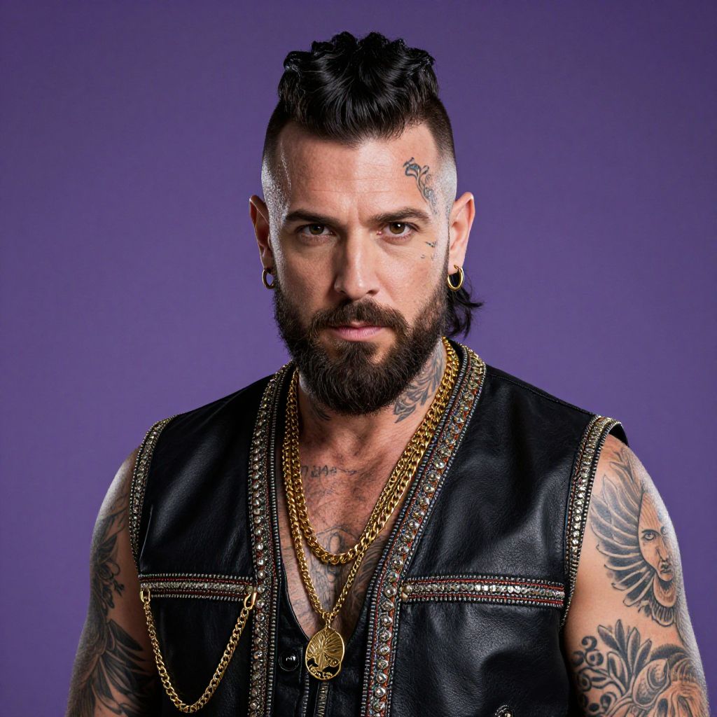 Portrait of a tattooed man with a black mullet hairstyle, facial tattoos, and a neatly groomed beard. He is wearing a black leather vest adorned with ornamental trim, gold chains, and earrings. The background is a solid purple gradient, highlighting his intense gaze and detailed body art.