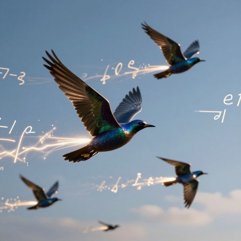 A luminous bird composed of sparkling particles and vibrant beams of color soars gracefully against a twilight sky, its flight leaving a trail of magical, equation-like patterns that shimmer like forgotten childhood dreams.