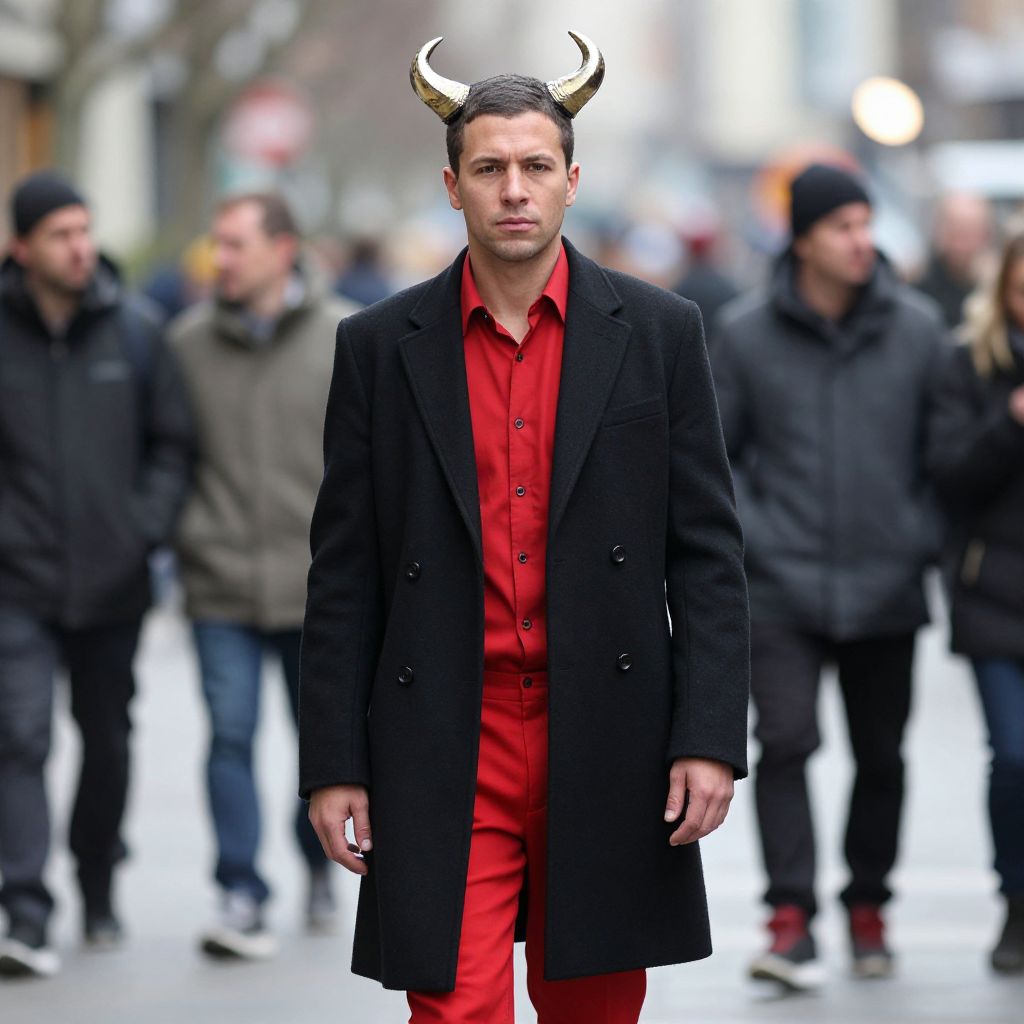 Man with horns on his head, wearing a black coat with a red shirt and red pants. He is standing on a street with other people in the background.