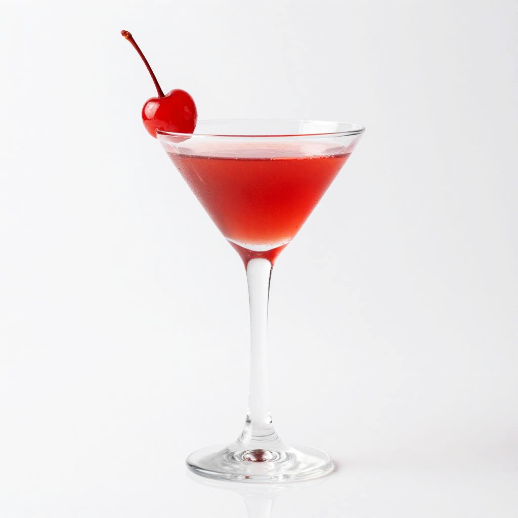 Photograph of a bright red cocktail in a clear, elegant martini glass with a slender stem. A small, vivid red cherry with a green stem is skewered on the glass's rim. The background is plain white, making the cocktail and cherry pop out. The glass casts a subtle reflection on the surface below. The overall image is crisp and colorful.