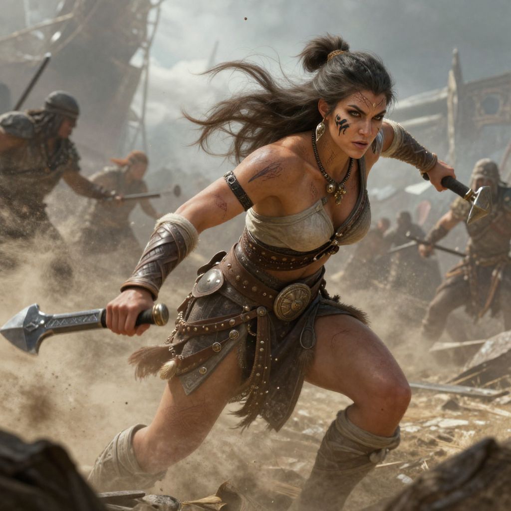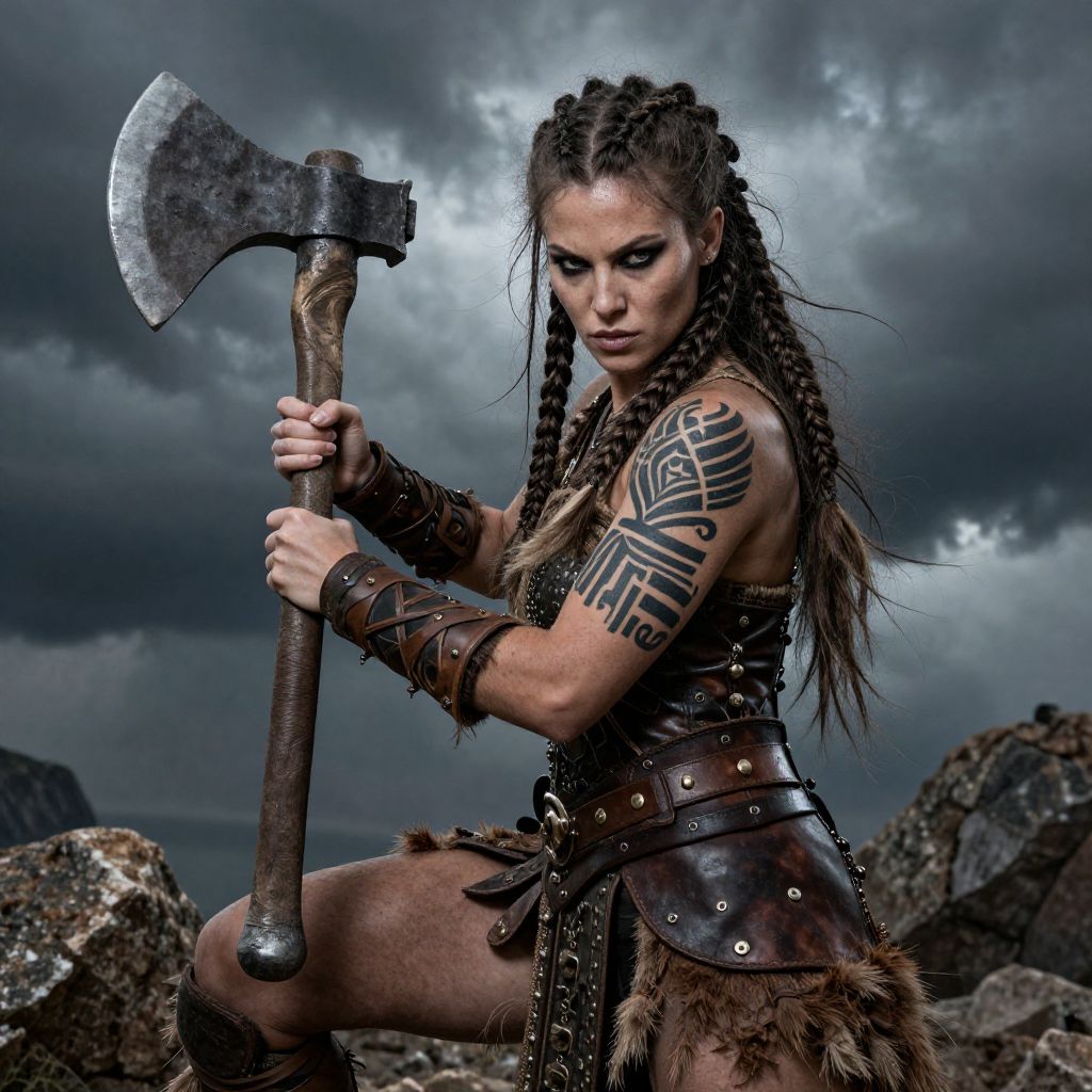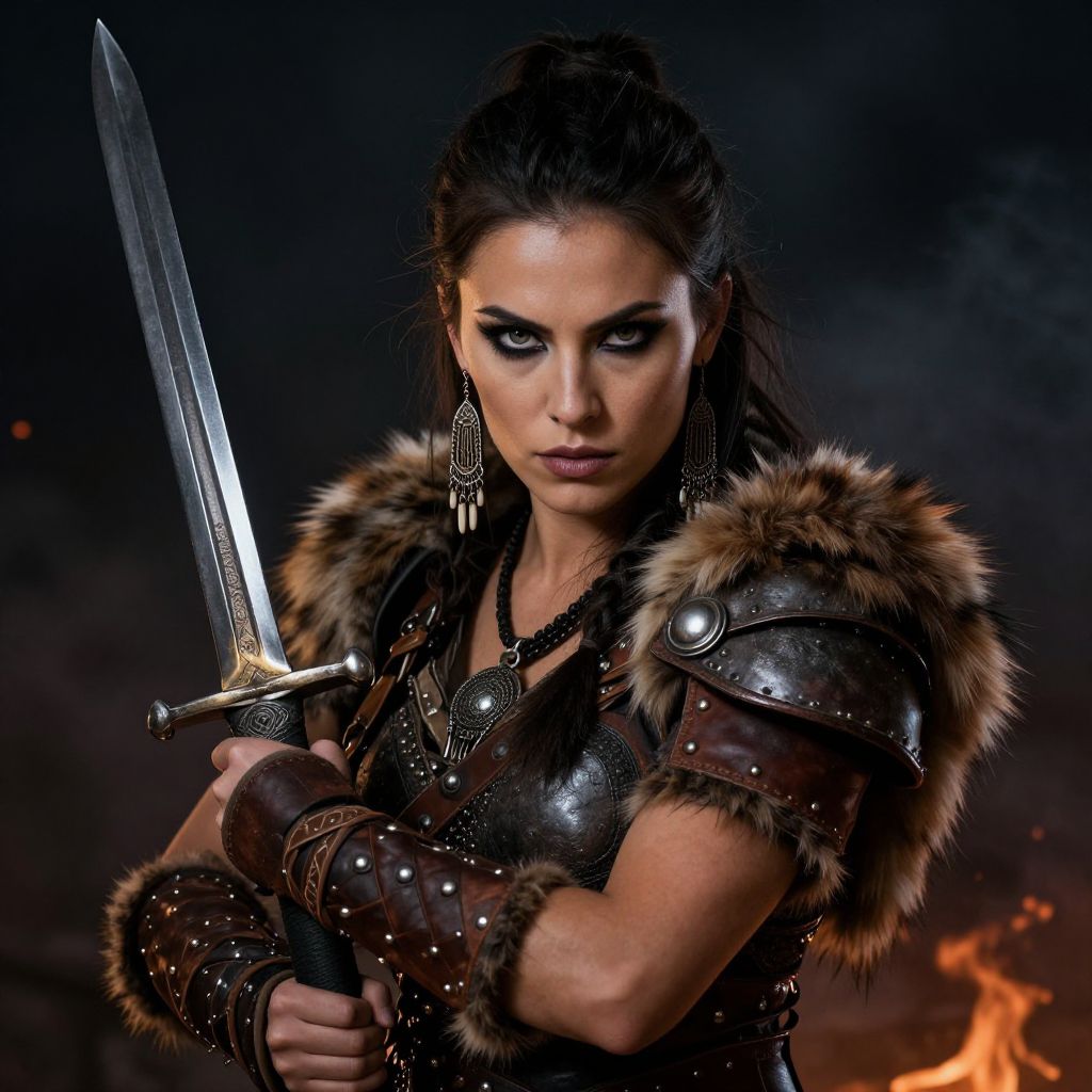 A fierce, tattooed woman with braided hair ignites a forge, holding a sword, sparks flying, helmet nearby, dimly lit workshop.