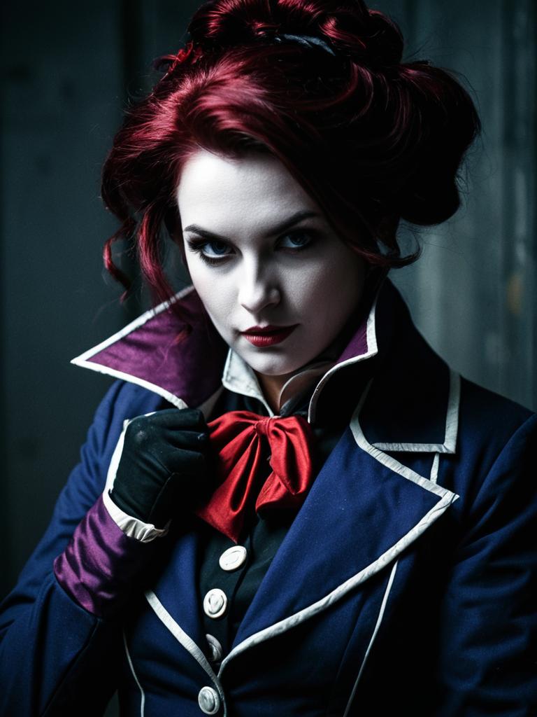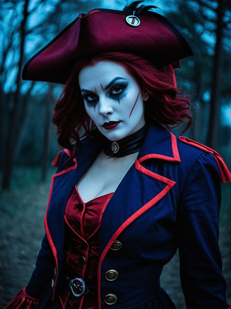 Woman in Facilier Cosplay, photorealistic outdoor portrait at twilight