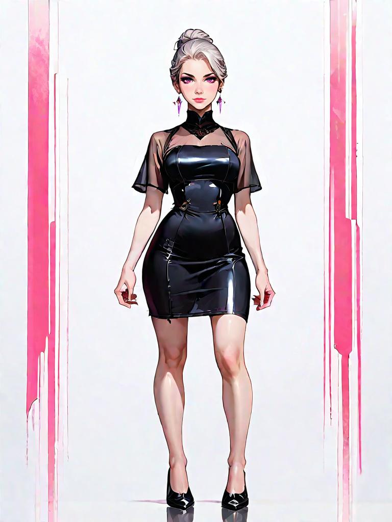 1girl, source_comics, realistic face, full body shot, Woman, chic, bodycon dress with color block design in black and beige, sleeveless, knee-length, round neckline, paired with black pointed-toe stiletto heels and a metallic clutch.