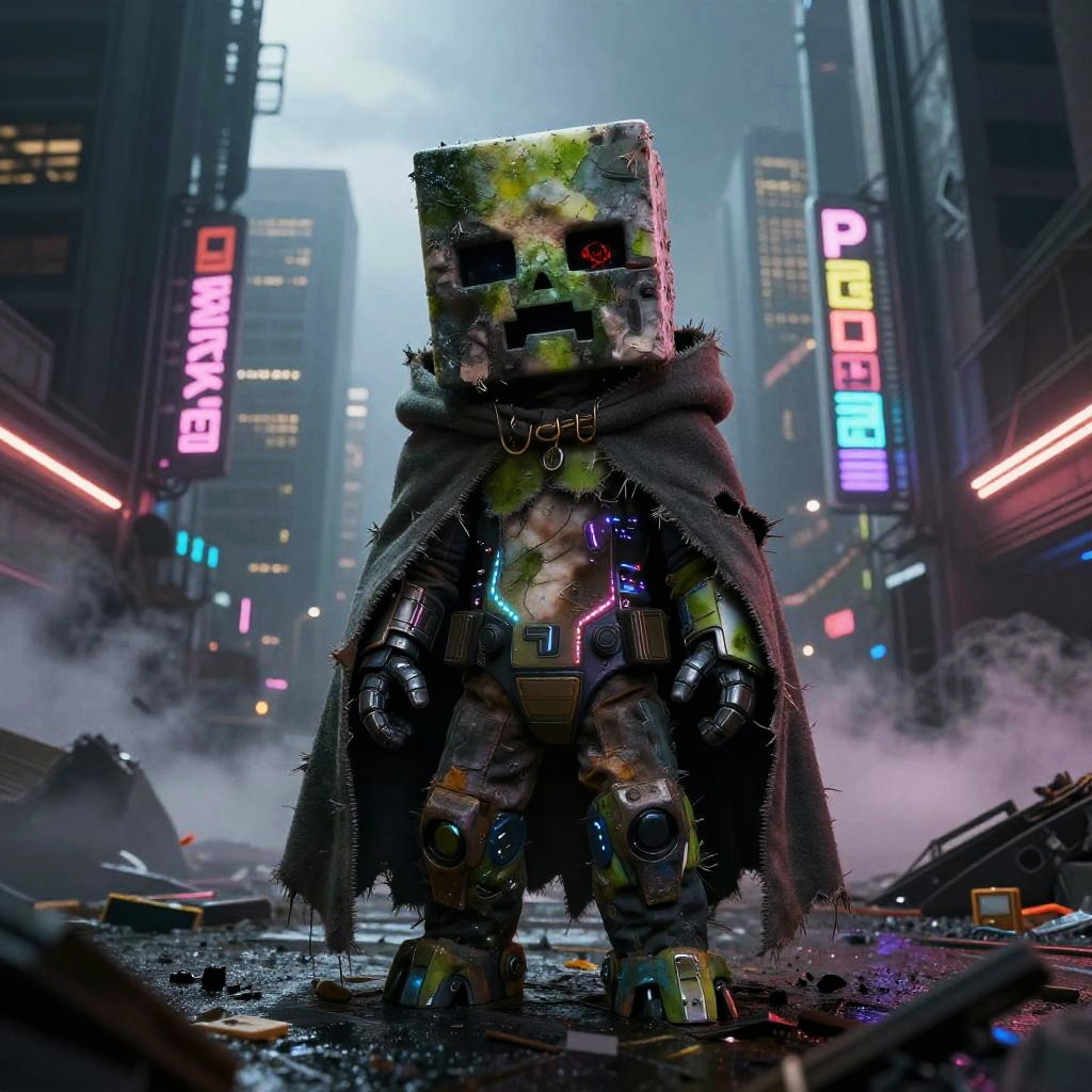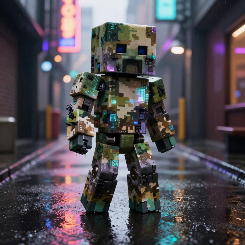Futuristic Sigma Creeper hunting in a neon-lit alley, augmented limbs, digital camouflage patterns, rain-soaked pavement reflecting colorful lights, cinematic composition