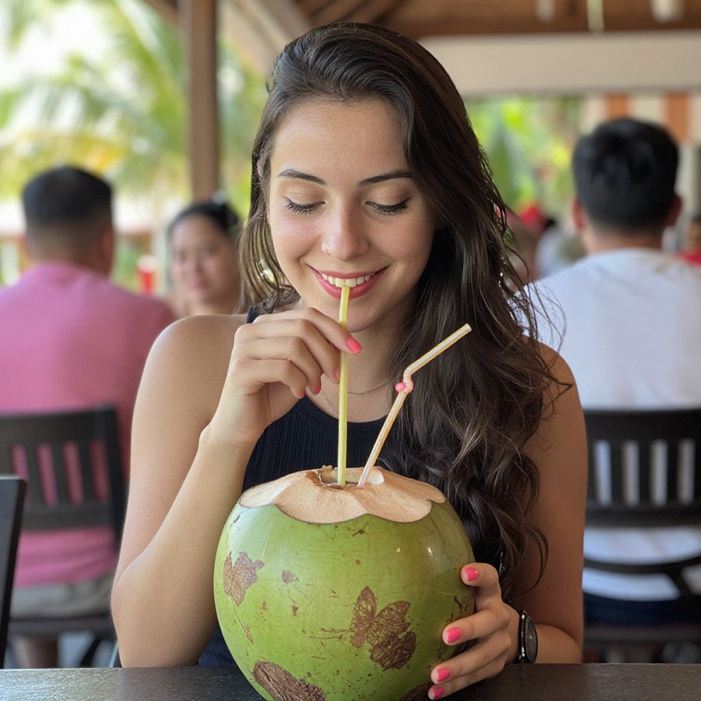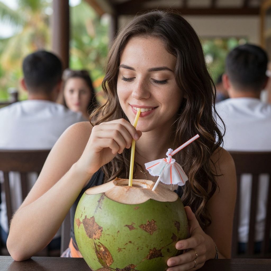 Smiling woman enjoying a refreshing drink from a green coconut with two long straws while seated at an outdoor restaurant, surrounded by blurred figures and natural surroundings.