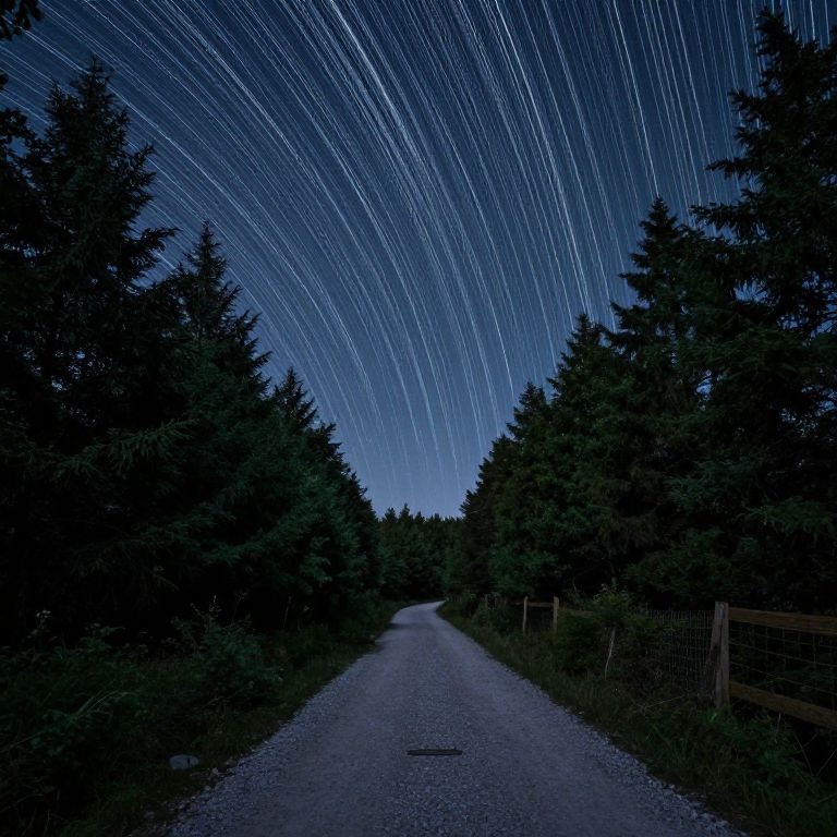 Under the celestial dance of star trails, a quiet gravel path winds through a serene forest, inviting introspection and a profound connection to the timeless rhythm of the universe.