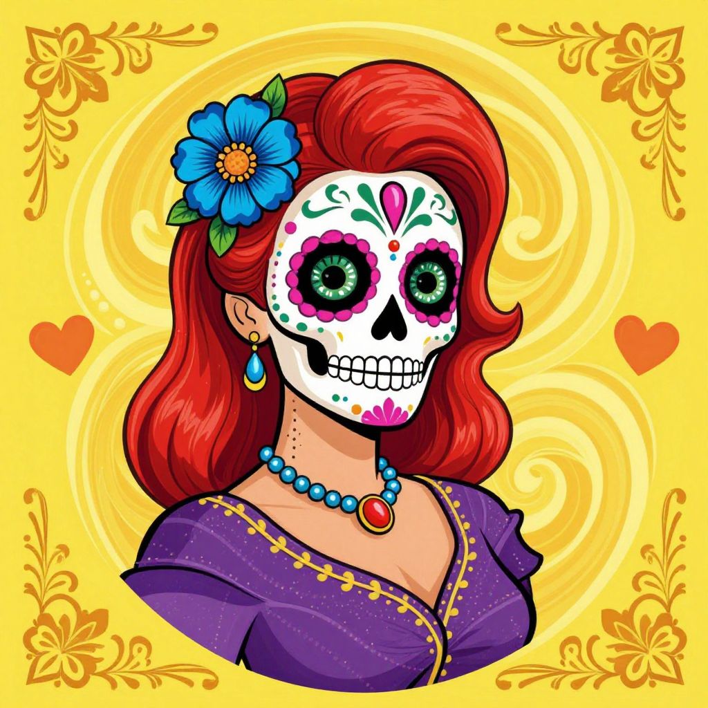 Vibrant sugar skull artwork featuring a pin-up style woman with bold red hair adorned with a blue flower, intricate facial makeup including green eyes and pink accents, and elegant purple attire, set against a swirling yellow background decorated with floral patterns and heart motifs.