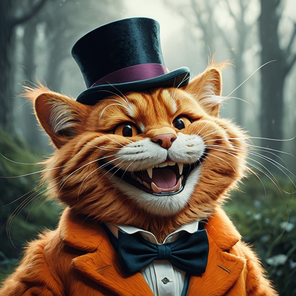 Cheerful anthropomorphic garfield, laughing, perfect face, orange fur, top hat, cinematic, elegant, highly detailed, psychedelic, digital painting, artstation, smooth, hard focus, illustration, art by jessica rossier and brian froud