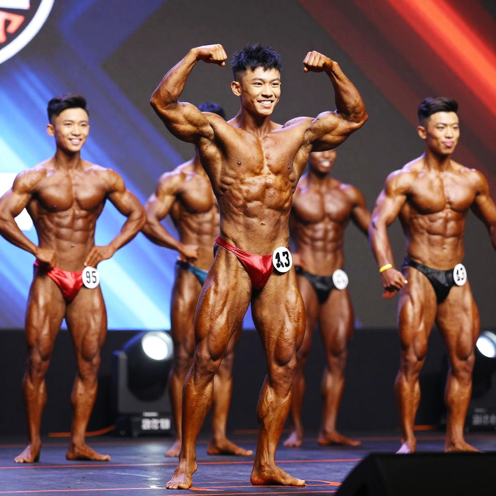 Teen bodybuilders posing on stage during a competition, showcasing muscular physiques in dramatic spotlight, detailed skin textures, vivid backgrounds, energy and confidence radiating