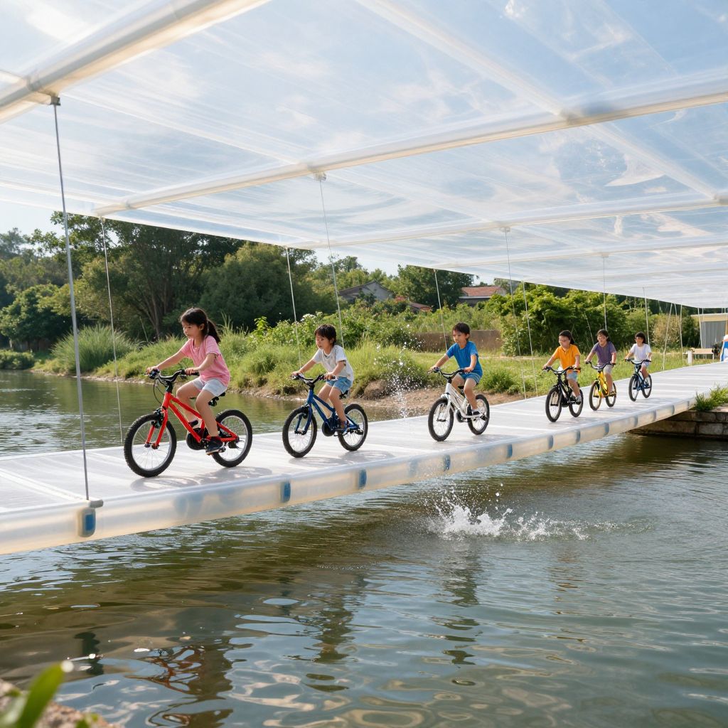 Children joyfully ride bicycles along the underside of a translucent, gelatinous bridge that floats above a serene waterway, its spongy surface shimmering with reflections of sunlight and dotted with playful splashes.
