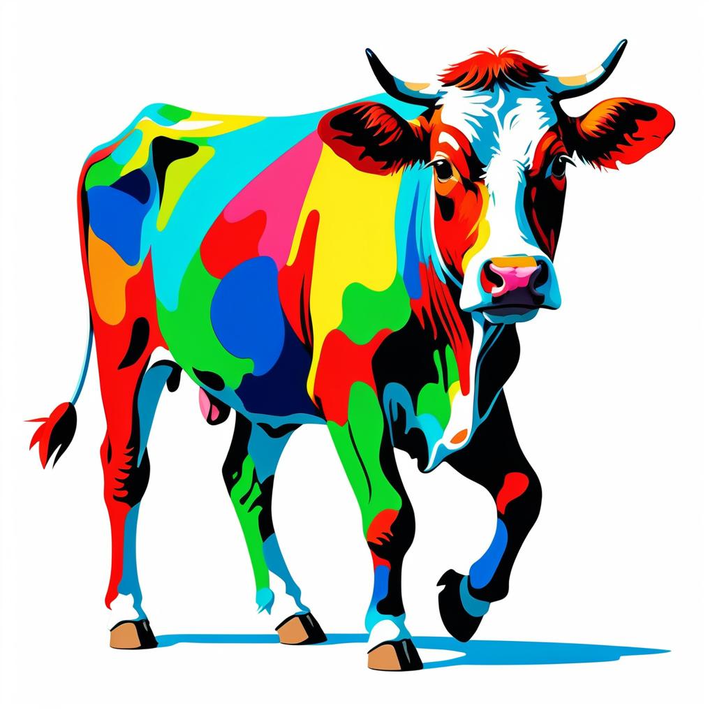 A vibrant, minimalist illustration of a cow walking. The animal is depicted in a pop art style with bright red, blue, green, and other multicolored patches on its body. The background is plain white, emphasizing the bold color scheme and abstract design of the cow.