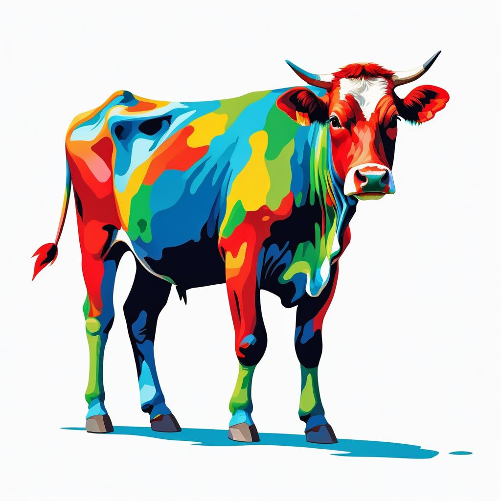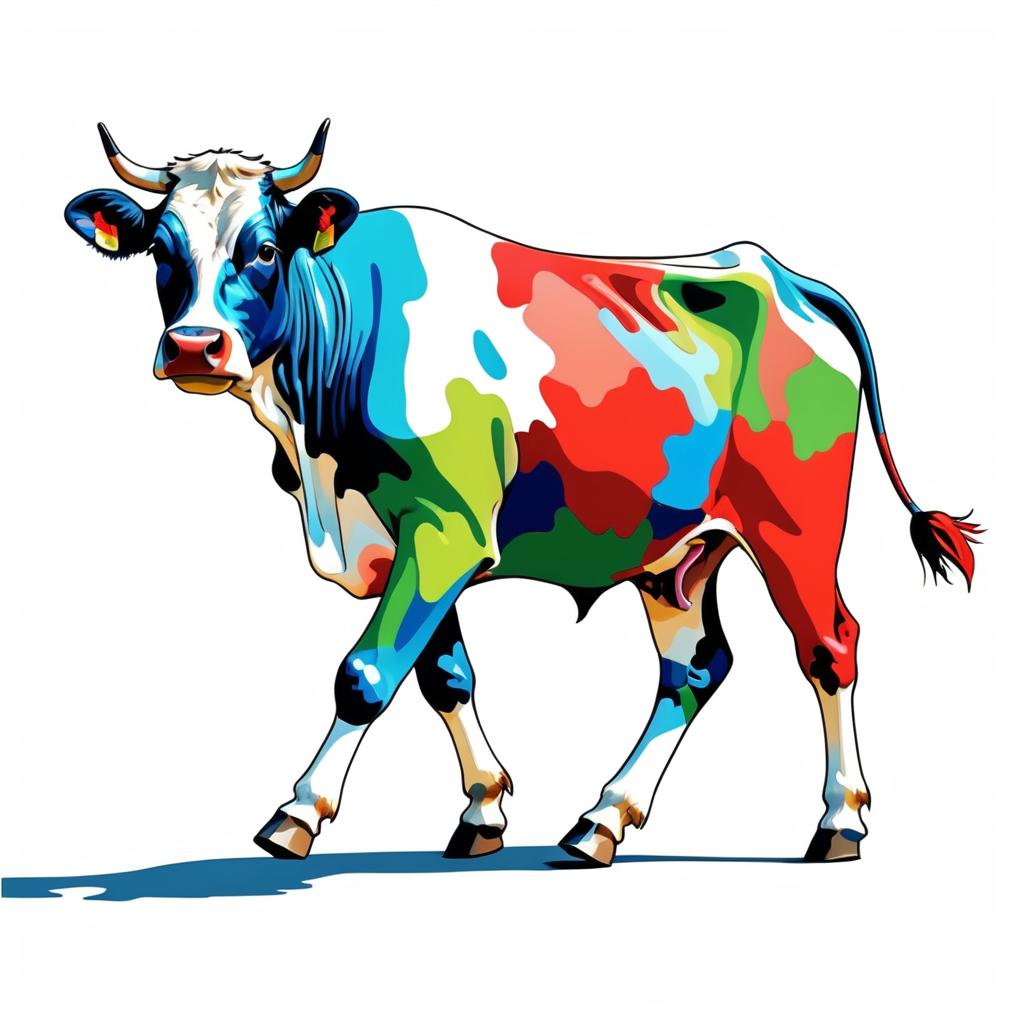 A vibrant colorful abstract cow walking, minimalist style, pop art influence, bright red and blue and green color patches on the animal, simple white background
