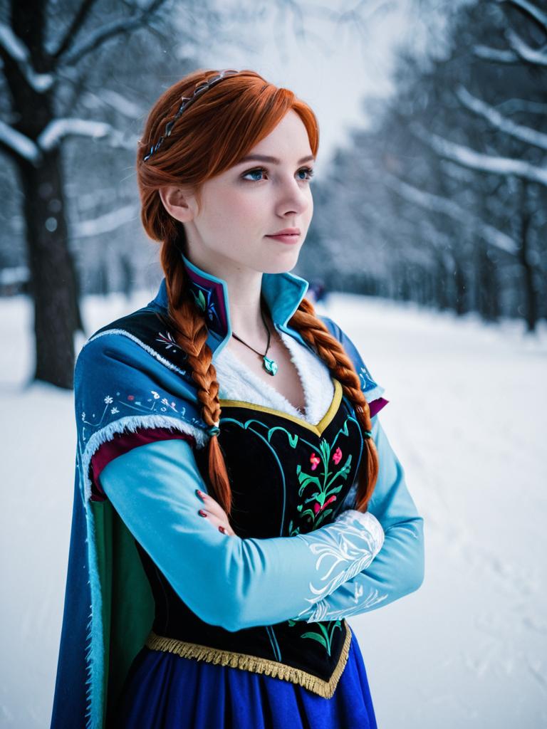 Woman in Adult Anna Frozen costume, photorealistic cosplay portrait, cinematic realism
