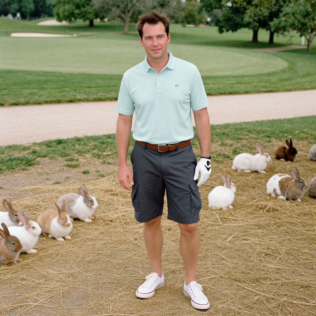 A man, pastel green golf polo, dark gray cargo shorts, white canvas sneakers, brown leather belt, lightweight performance material, shaded picnic area, soft hay underfoot, curious bunnies hopping, 3M analog film stock, relaxed smile, enjoying the moment. Man has masculine face and piercing eyes