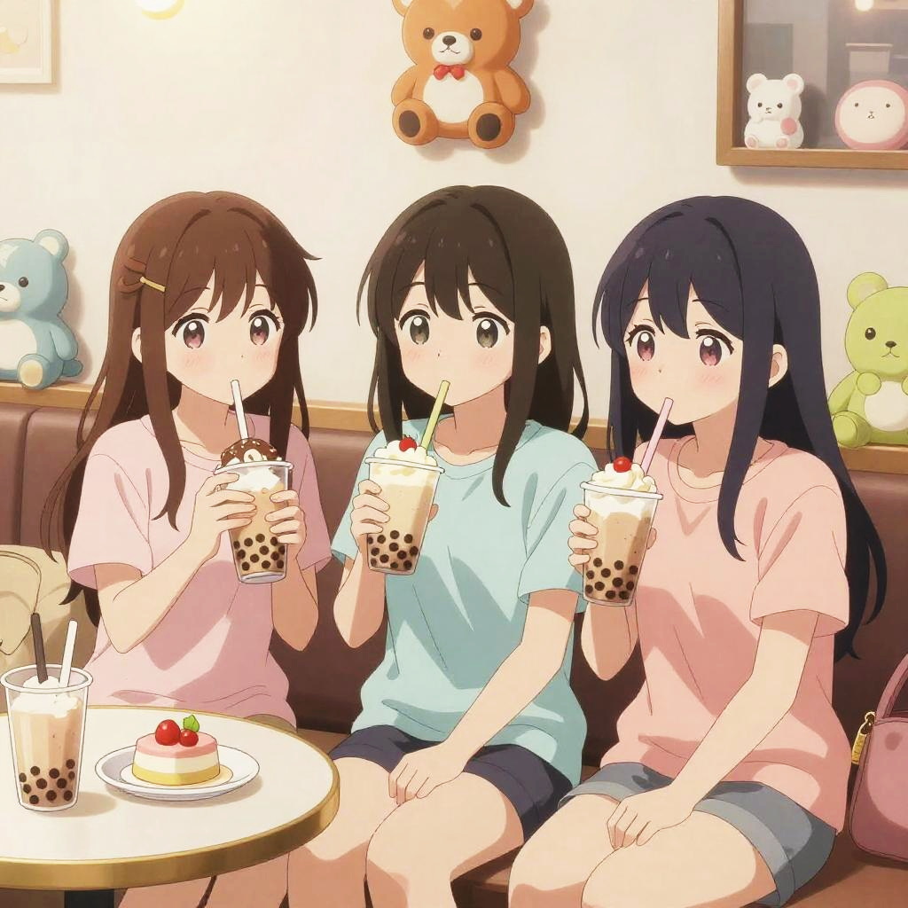 Anime-style digital drawing of two girls with brown and black hair, sitting on a green couch; a boy sits nearby. Bright, sunlit room.