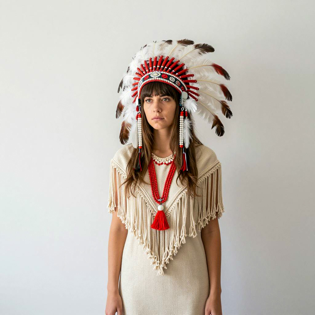 Photograph of a young woman with long brown hair and bangs, wearing a cream-colored macrame fringe dress and a traditional Native American-inspired headdress featuring white and red feathers. She is accessorized with red and white beadwork and a red necklace with a small red tassel. The woman has a serious expression and stands against a plain white wall with soft natural lighting, highlighting the detailed tribal fashion elements.