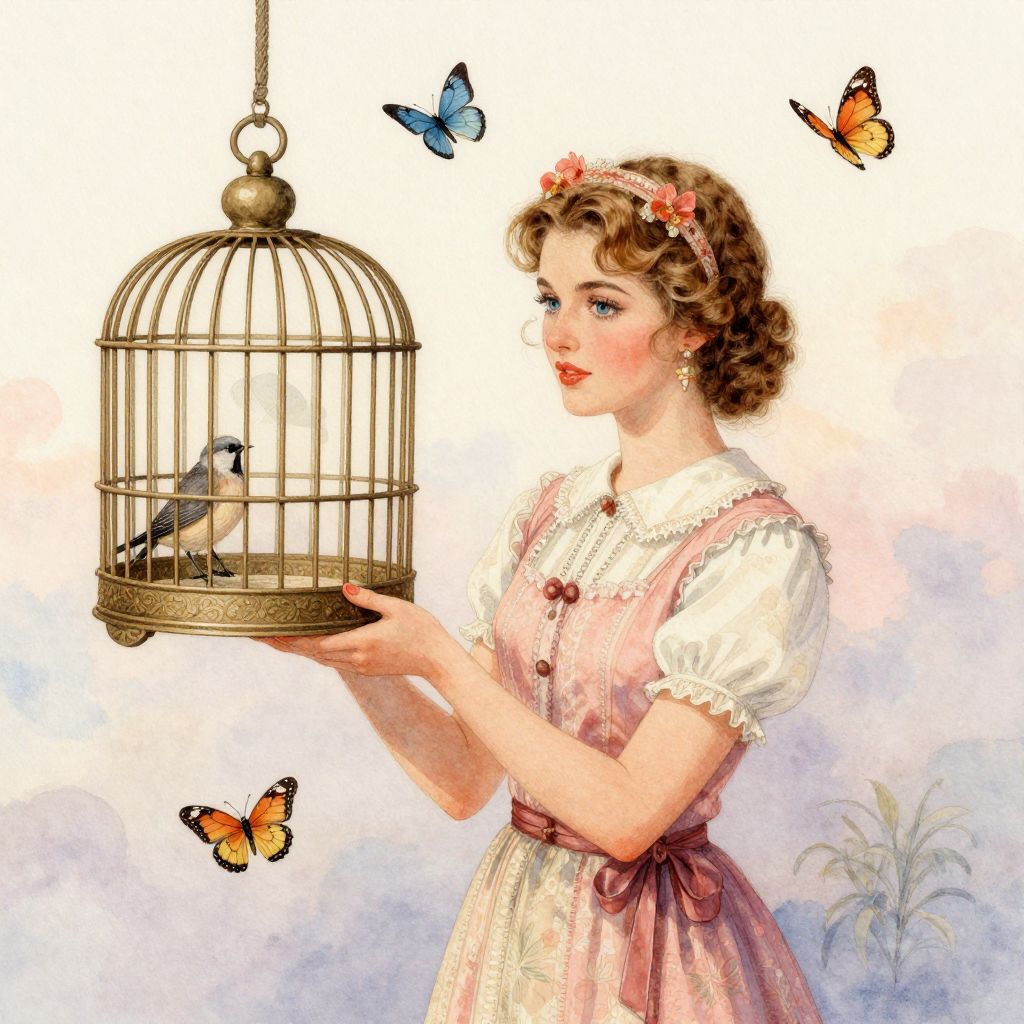 A watercolor illustration of a vintage, pastel-toned woman holding an open cage with a bird inside, while butterflies fly in the sky.