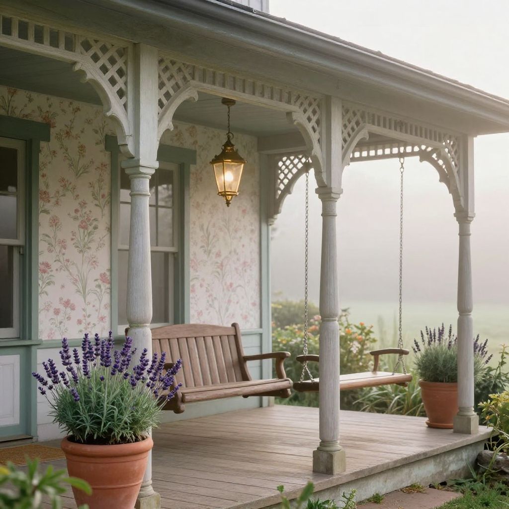 Victorian farmhouse porch under soft morning mist, classic turned wood columns and intricate lattice work, vintage brass lanterns hanging from ceiling, pastel floral wallpaper glimpsed inside, clay pots filled with lavender and rosemary, old wooden swing gently swaying, peaceful countryside vibe