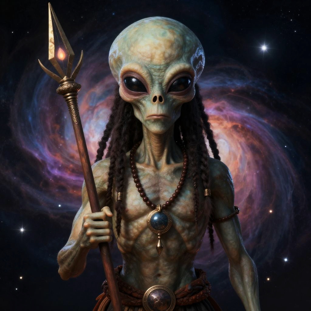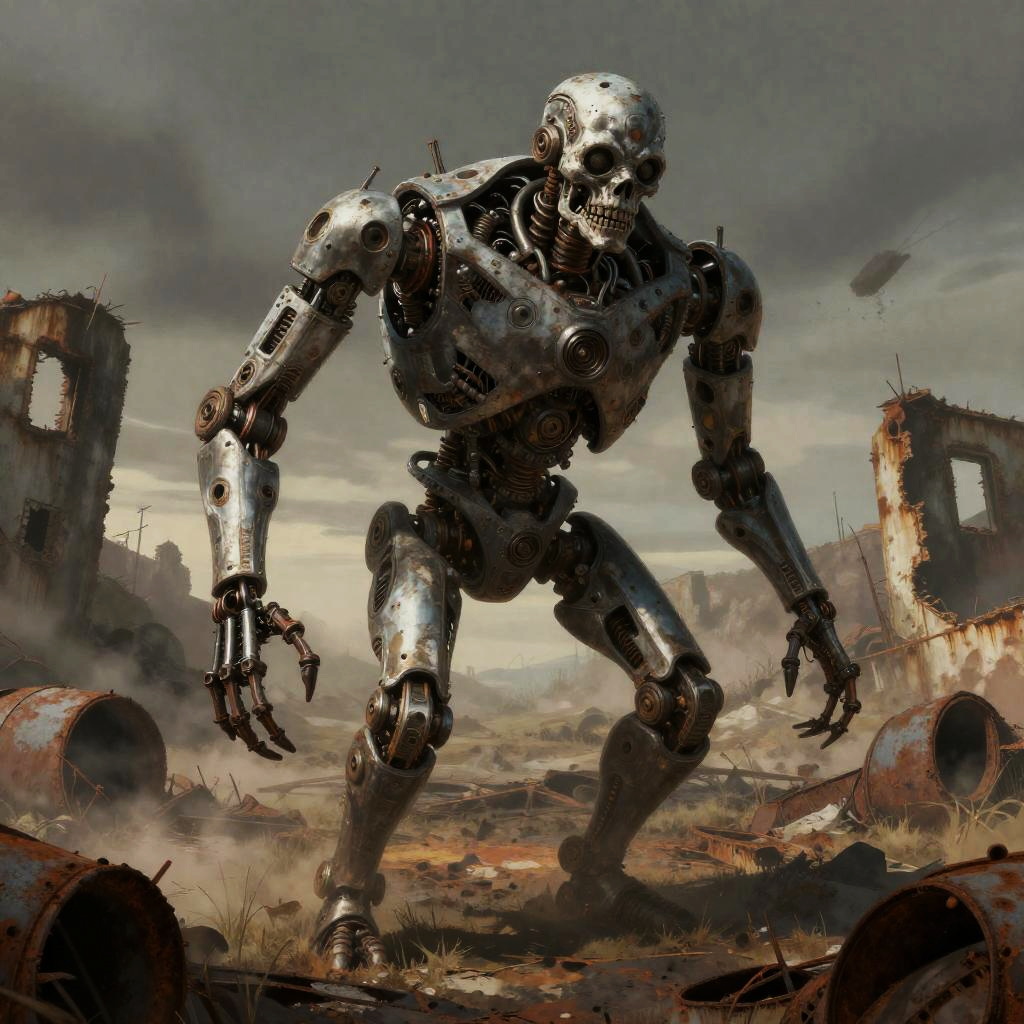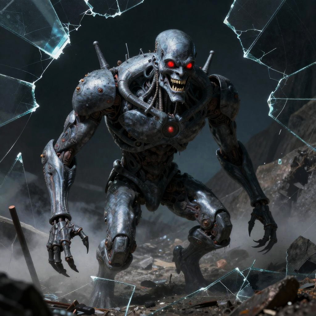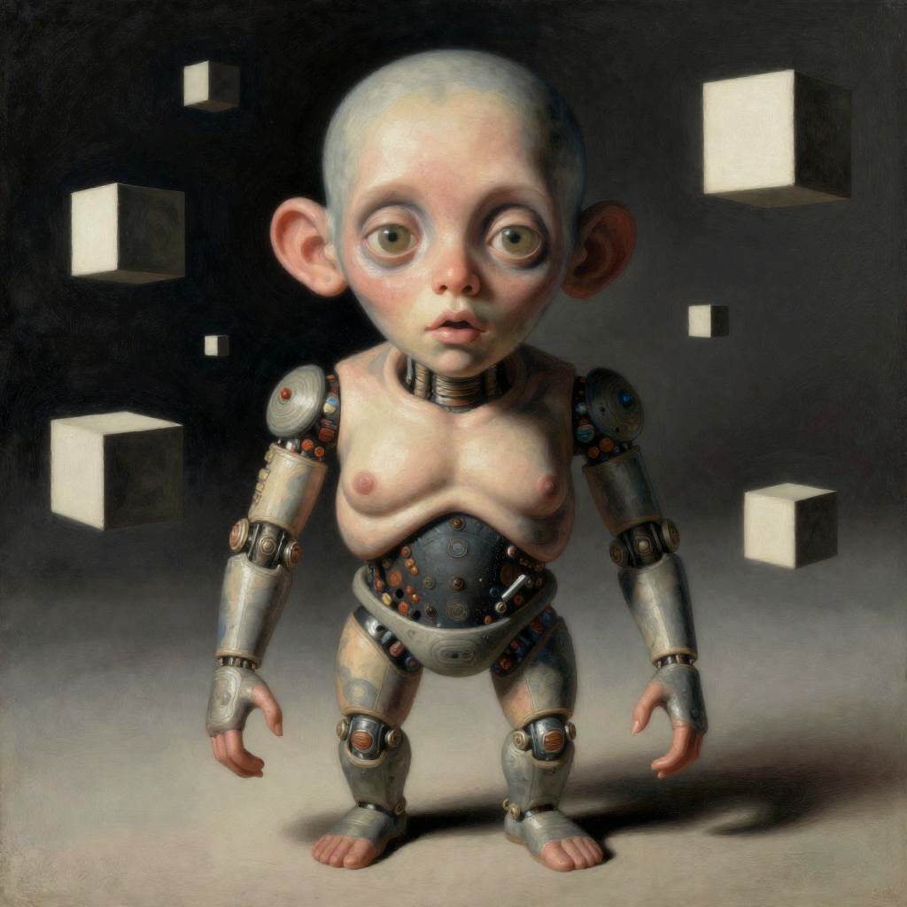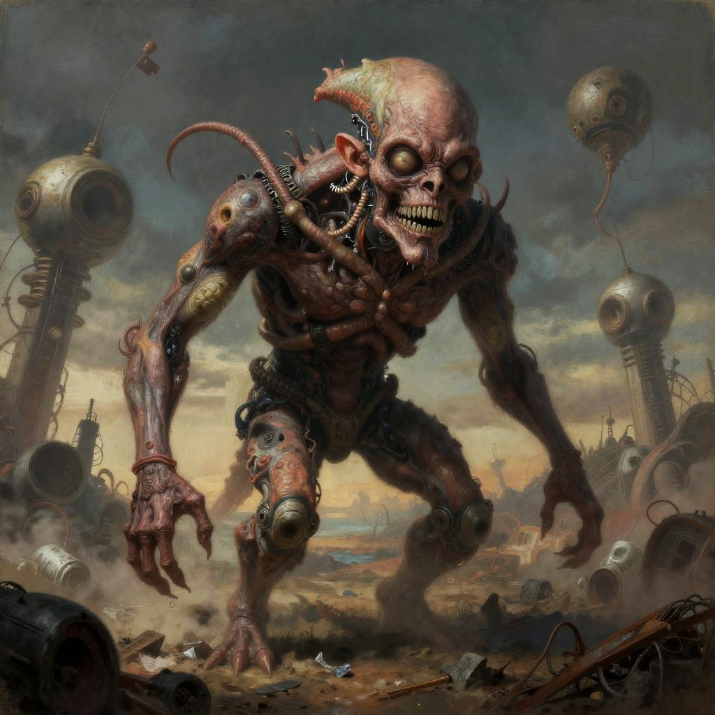 Vintage cyborg figure with exaggerated, distorted features, style inspired by H.R. Giger, neon futurist realm