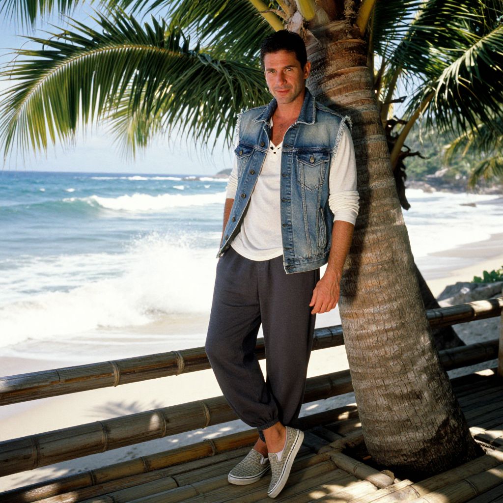 A man, faded denim vest, band tee, relaxed-fit joggers, canvas slip-on shoes, long-sleeve henley shirt, sun-drenched bamboo deck, ocean waves crashing, lush tropical palms swaying, eastman film stock, leaning casually against a palm tree, relaxed smile.Man has masculine face and piercing eyes