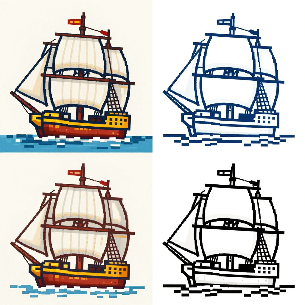This image is a collage of four pixelated drawings of a classic sailing ship. Each quadrant showcases a different style: top left has a colorful, detailed ship with a red hull and white sails; top right is simpler with blue and white; bottom left is a brown, sketch-like version; bottom right is a black-and-white, outlined drawing. The background is plain and light-colored.
